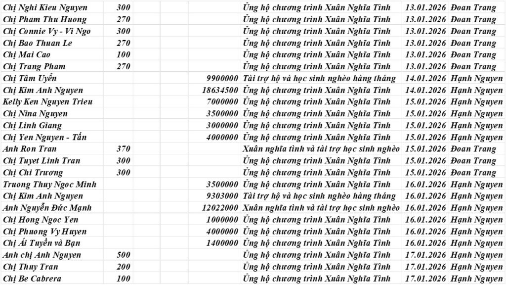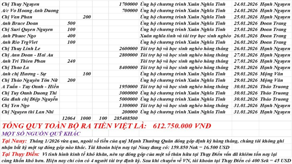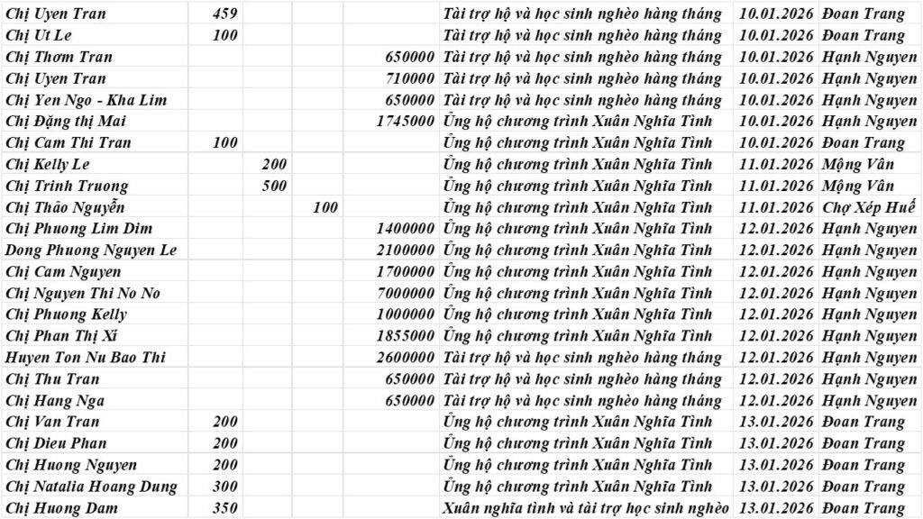 Tháng 1 chưa đến đã vội đi, nhưng dư âm của những hoạt động dồn dập nhằm lan tỏa yêu thương của Phuc’s Fond dường như vẫn còn hiện hữu đâu đây. Hơn 350 hộ nghèo đã được Phuc’s Fond, thay mặt Hội Đồng Hương Thừa Thiên Huế vùng New England, đến thăm và trao tận tay tiền hỗ trợ sau lũ. Tuy bận rộn là thế, nhưng các hoạt động định kỳ hằng tháng của chúng tôi vẫn không hề bị gián đoạn. Các em học sinh và các hộ nghèo được Phuc’s Fond cưu mang thường xuyên đã tiếp tục được chúng tôi đến thăm và trao tiền hỗ trợ đúng như sự hứa khả suốt gần 15 năm qua – chưa từng thay đổi.