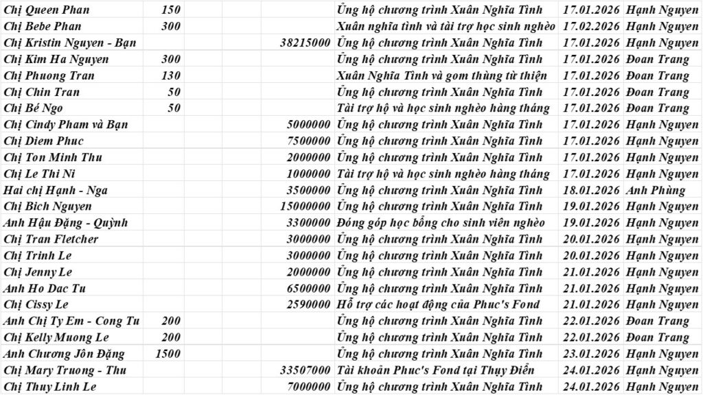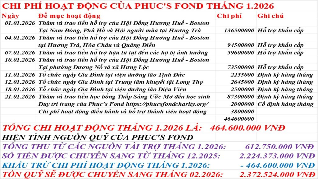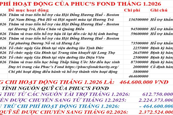Kết thúc tháng 1 không có nghĩa là chúng ta sống trong quá khứ, mà quá khứ chính là nền tảng vững chắc để Phuc’s Fond tiếp tục hành trình và hạnh nguyện của mình. Năm cũ sắp qua, Tết cũng đang đến gần, cho phép chúng tôi, thay mặt Ban Điều Hành Phuc’s Fond, kính chúc quý vị một năm mới an khang, thịnh vượng, cát tường như ý. Xin chân thành tri ân quý ân nhân đã luôn đồng hành cùng chúng tôi trong suốt chặng đường qua, góp phần xoa dịu những nỗi đau của các phận đời còn nhiều bất hạnh.